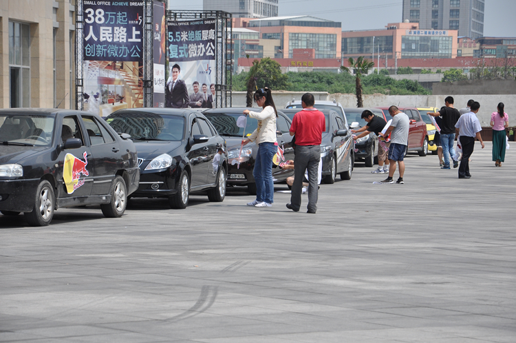 8月24日,组织了一场小型的爱心车队公益活动。我们在京阳数码广场集体贴车标,以此获得6箱红牛饮料,然